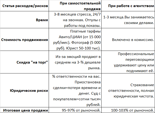 Самостоятельно вы все равно потратите деньги на рекламу, юриста и, возможно, на исправление ошибок в документах. Эти расходы часто равны половине комиссии агента.